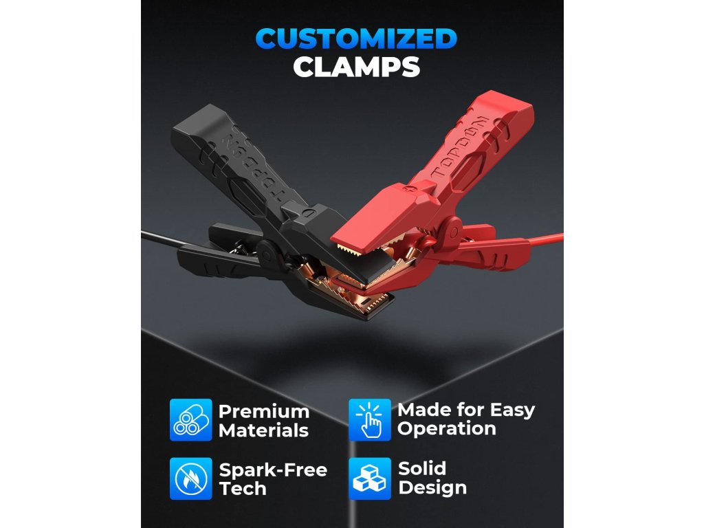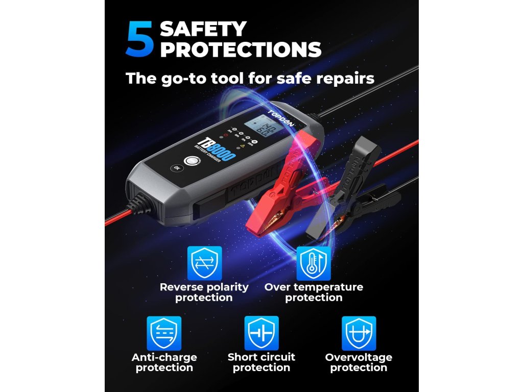 TOPDON TB 8000 nabízí vynikající bezpečnostní funkce díky 5-ti vestavěným systémům ochrany proti přepólování, zpětnému nabíjení, zkratu, přehřátí a přepětí. Navíc je tato nabíječka baterií vybavena inovativní technologií pro eliminaci jisker.