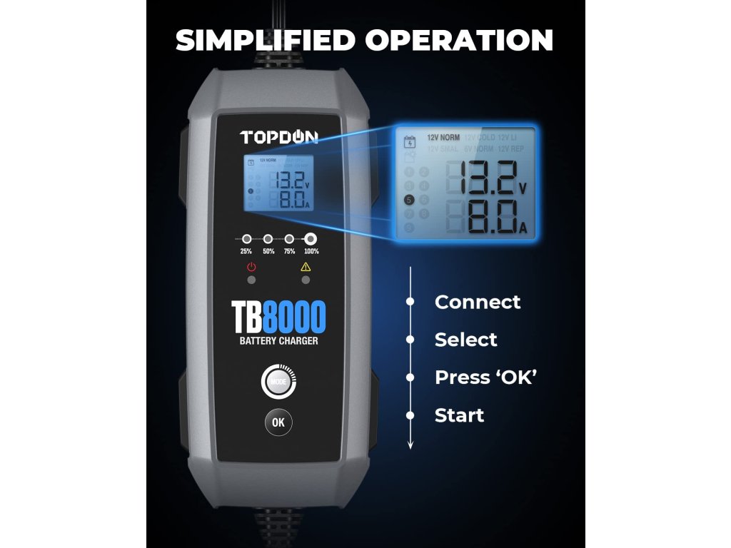 9stupňový systém inteligentního nabíjení TB8000 poskytuje uživatelům špičkovou technologii, která automaticky identifikuje stav baterie a dodává nejvhodnější proud. S tímto zařízením se již nemusíte obávat poškození baterií!