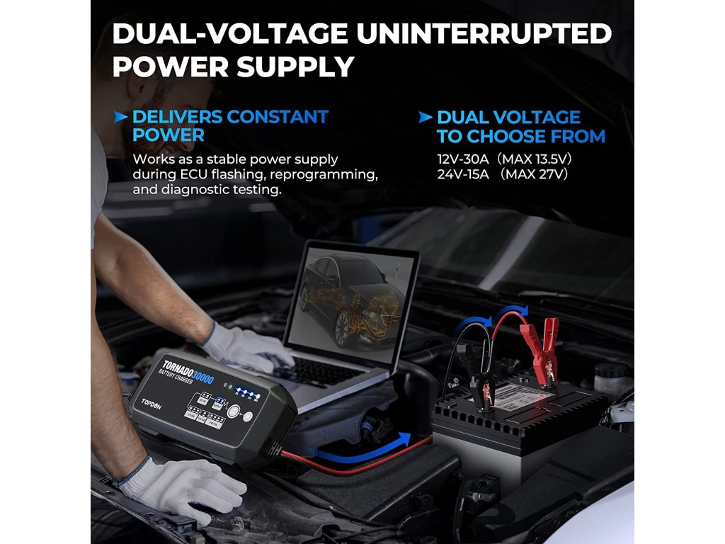 TORNADO 30000 je vytvořena jak pro osobní, tak pro komerční užití. Dokáže oživit, opravit a dobít jak lithiové, tak lead-acid baterie. Také ale dokáže sloužit jako stabilní napájecí zdroj při opravách, testování nebo diagnostice automobilu bez nutnosti startování vozidla.