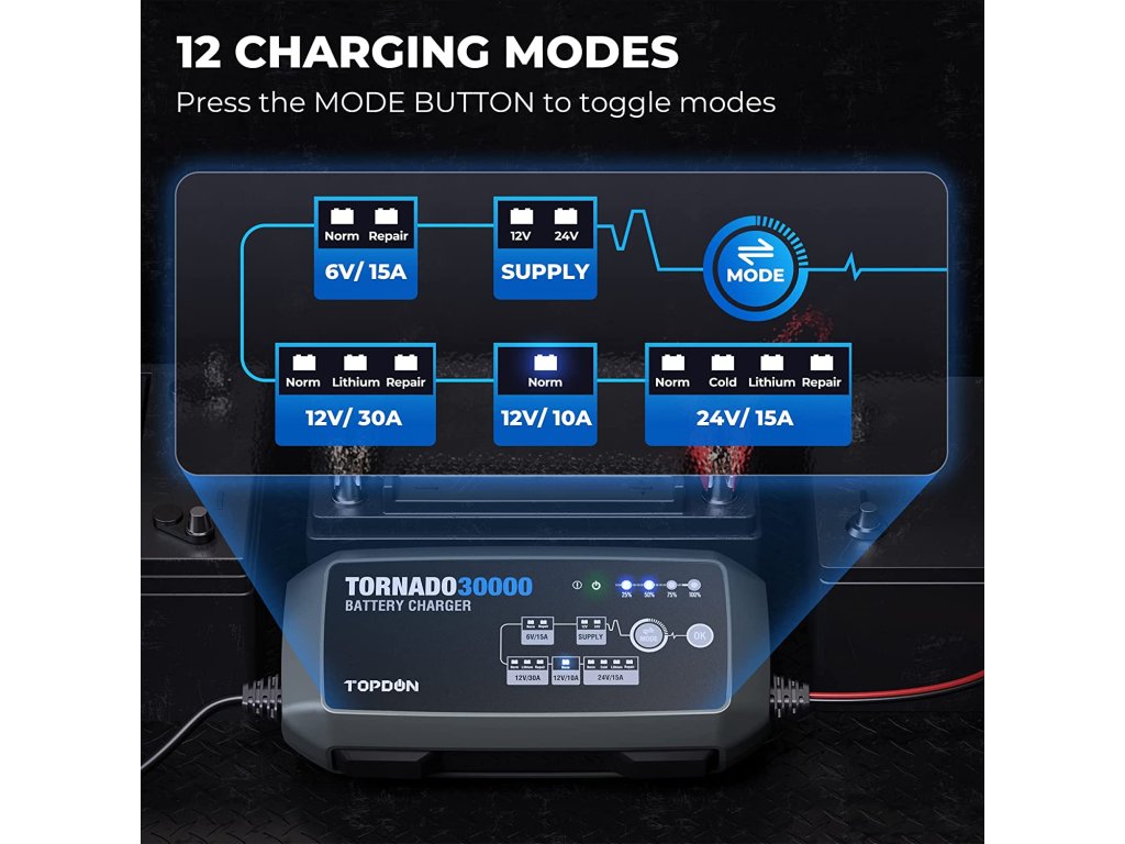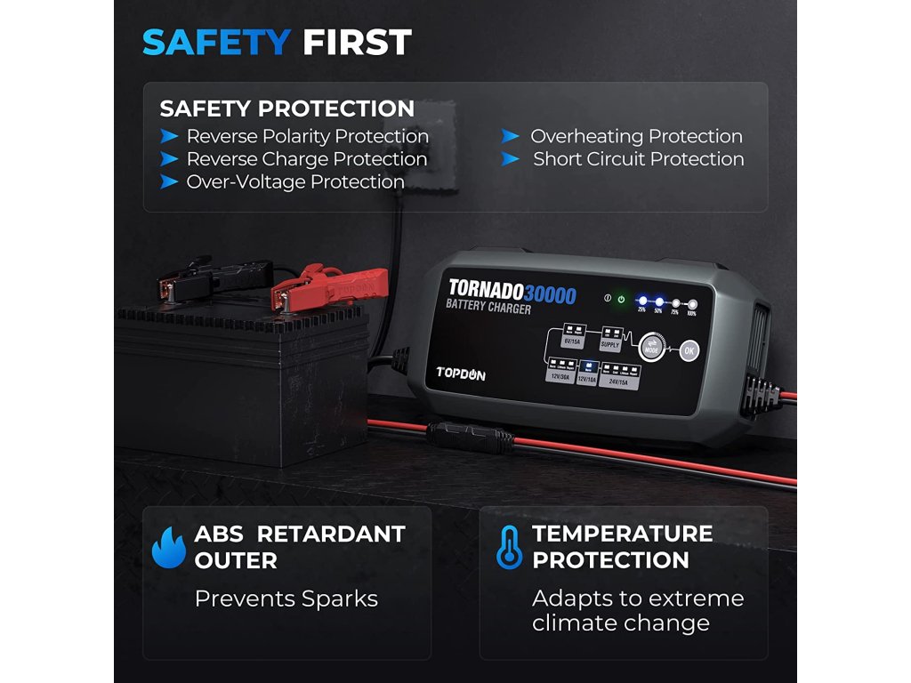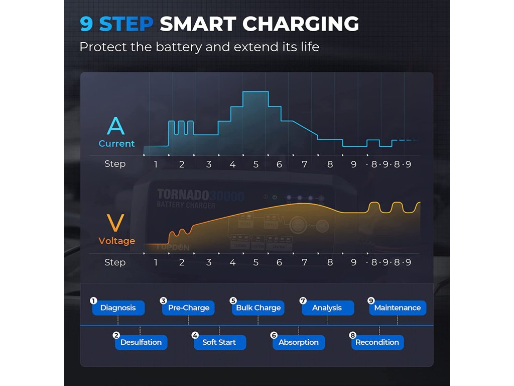 S jeho 9stupňovým, chytrým nabíjením a s jeho 12 nabíjecími módy, poskytuje TORNADO30000 bezkonkurenční možnost nabíjení a ochrany pro svého uživatele.
