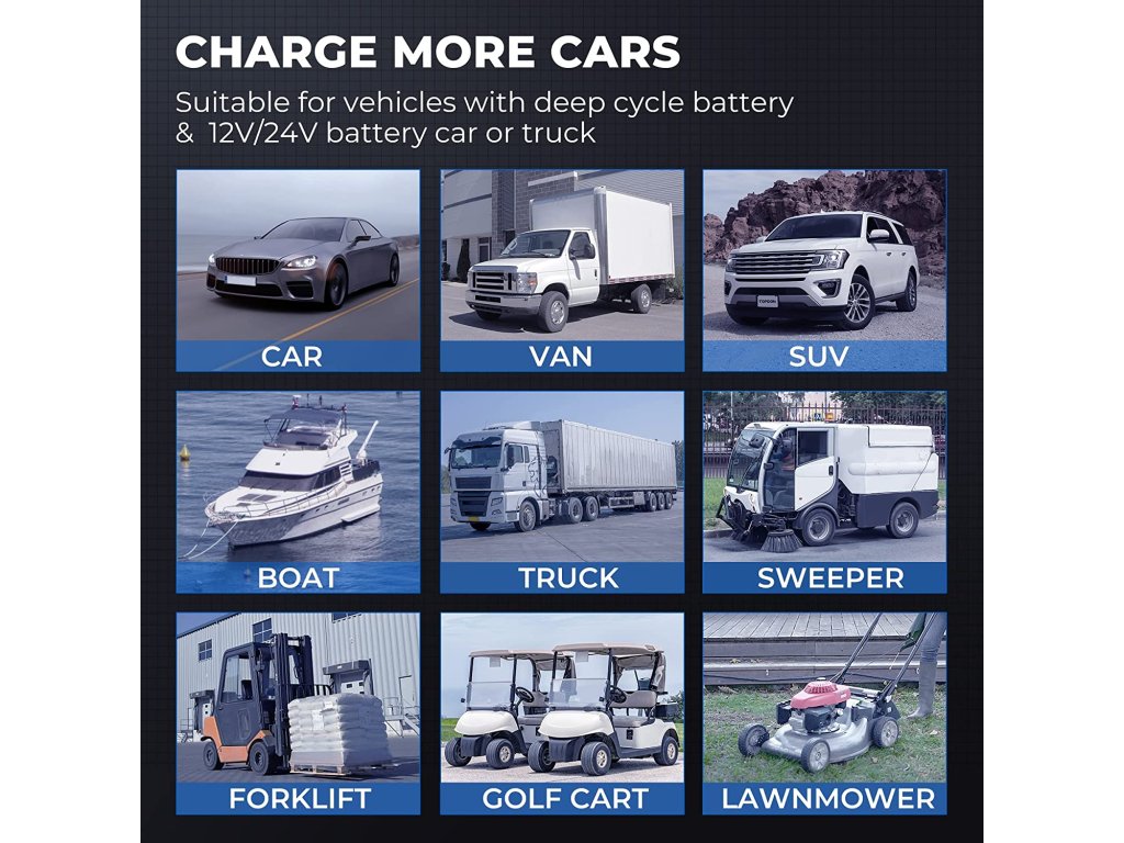 Díky podpoře 6V, 12V a 24V baterií je tato nabíječka vhodná pro více typů baterií, včetně AGM, LI WET, GEL, MF CAL a EFB!