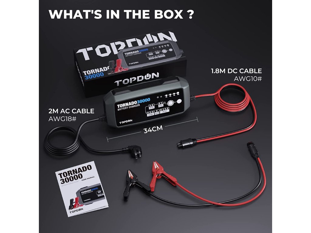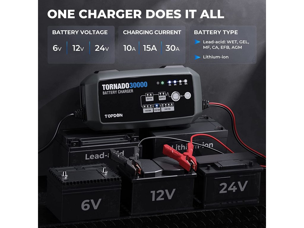 Nabíječka autobaterií TOPDON TORNADO 30000Tato profesionální nabíječka autobaterií je vhodná pro většinu typů baterií (AGM, LI WET, GEL, MF CAL a EFB) se špičkovým výkonem 360W! Kompatibilní s 6V, 12V i 24V bateriemi, se třemi možnostmi nabíjecího proudu 10A, 15A a 30A.