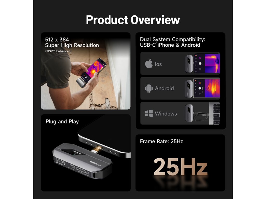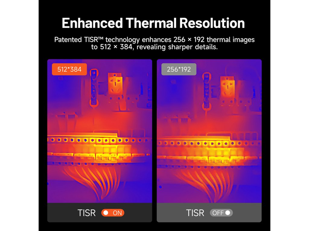 Oproti modelu TC002C přináší technologie TISR (Thermal Image Super Resolution) až 512 × 384 px pro ostřejší a přesnější snímky, vyšší obnovovací frekvenci 25 Hz a kompatibilitu nejen s iOS, ale i s Android a Windows.