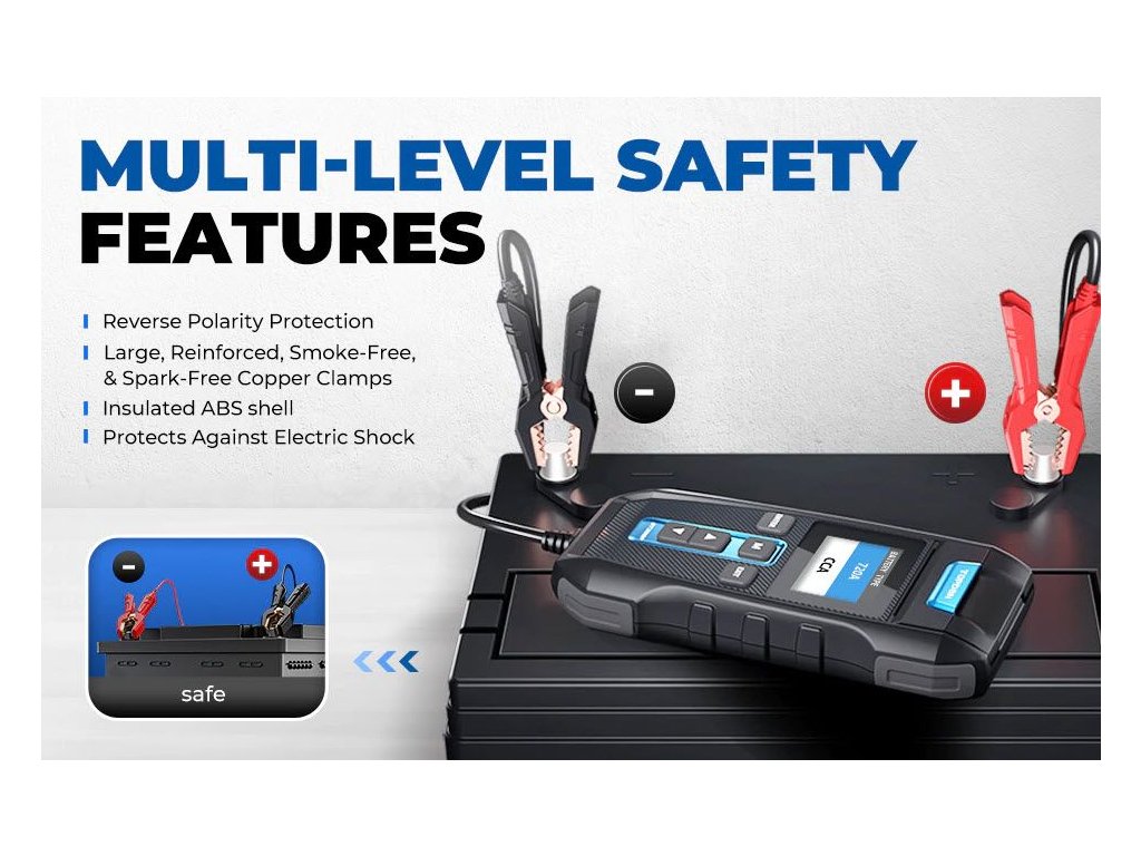Podmínkou pro testování baterií je nadstandartní bezpečnost. Tu TOPDON BT300P zajišťuje měděnými svorkami s ochranou proti jiskření, kabelem opláštěným PVC a vestavěnou automatickou ochranou proti přepólován. Jeho izolovaný kryt ABS chrání celé zařízení a je odolný proti poškození.
