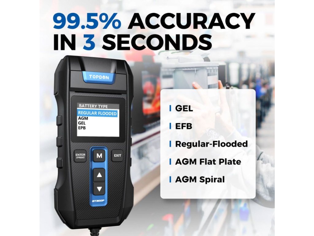 S nejnovější testovací technologií TOPDON, může tento moderní tester BT300P pro 12 V a 24 V baterie, zjistit přesný aktuální stav baterie do pouhých 10-ti sekund. Přesnost naměřených hodnot 99,5 %