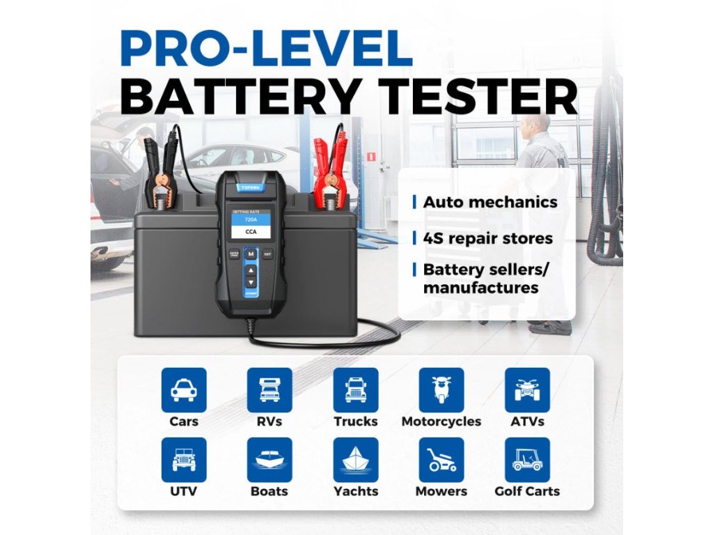 Rozpoznává selhání startovacích a nabíjecích systémů v 12 V a 24 V autech, motocyklech, nákladních vozech, obytných vozech, ATV, terénních vozech, člunech, jachtách, atd. Většina problémů s vozidlem, které jsou způsobeny vadnou baterií, lze vyřešit s přístrojem BT300P.