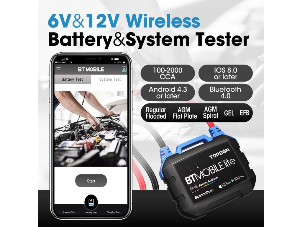BT Mobile Lite je kompatibilní s nejběžnějšími typy baterií, jako jsou zaplavené, s vápníkem (Ca/Ca), GEL, EFB, AGM, hybridní atd.