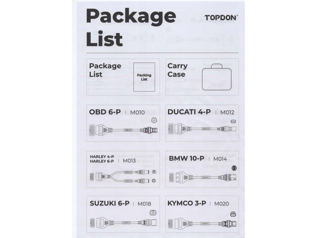 Topscan Moto Master Kabelová Sada slouží k propojení motocyklu s diagnostickým zařízením TopScan Moto. Tento adaptér umožňuje správné připojení motocyklů konkrétní značky k zařízení, což umožňuje čtení diagnostických dat a provádění servisních kontrol. Použití kabelové sady je nezbytné pro motocykly, které nejsou vybaveny standardním OBD-II portem.