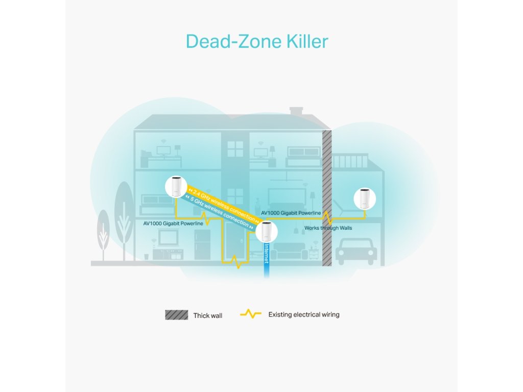 Deco P9 kombinuje duální Wi-Fi a powerline pro vytvoření silnější mesh sítě. Technologie Powerline využívá elektrické rozvody vašeho domu k vytvoření silnějšího propojení mezi jednotkami Deco tím, že snižuje dopad stěn a jiných překážek na signál a poskytuje ještě vyšší rychlosti sítě a skutečně bezproblémové pokrytí .
