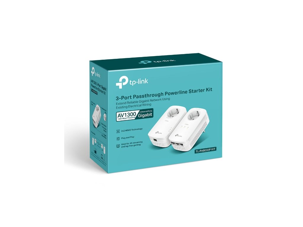 TP-LINK TL-PA8033P KIT • Základní sada adaptérů Powerline AV1300 s průchozí zásuvkou a 3 gigabitovými porty*Kompatibilní se standardem HomePlug AV2 – vysoká rychlost přenosu dat dosahující až 1 300 Mbit/s1 uspokojí veškeré nároky vašich online aktivit.
