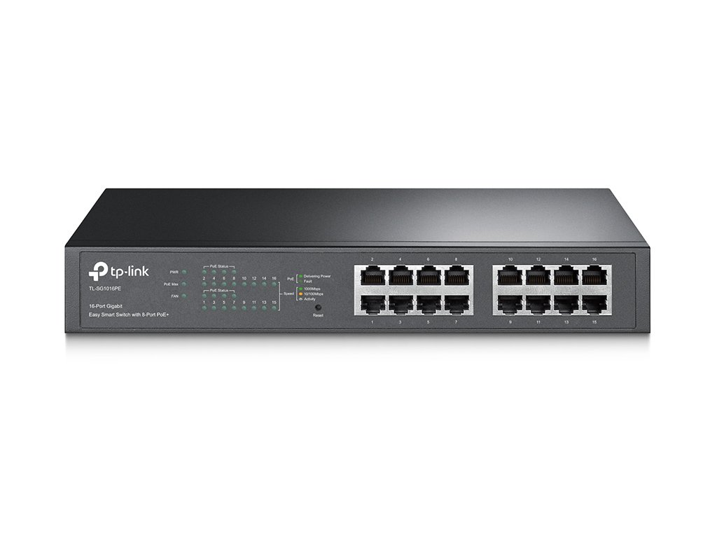 TL-SG1016PE*16-Port Gigabit Desktop/Rackmount PoE+ Easy Smart Switch, 16 Gigabit RJ45 ports including 8 PoE+ ports, 150W PoE Power supply, PoE Managment, MTU/Port/Tag-based VLAN, QoS, IGMP Snooping, Steel case