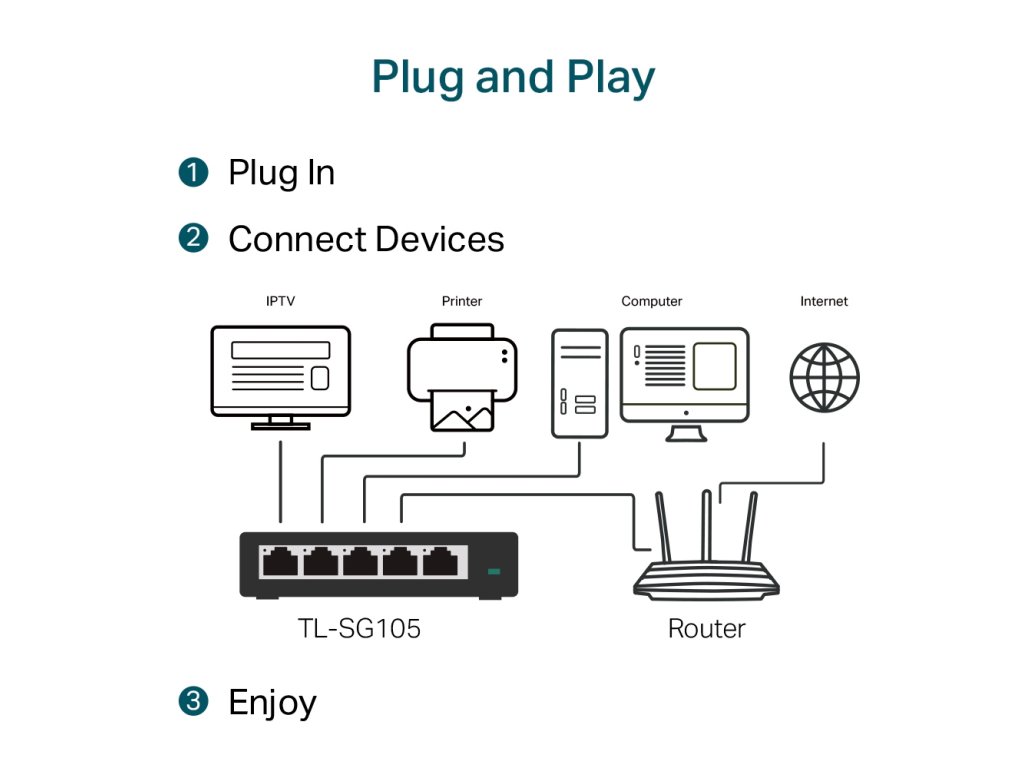 The TP-LINK 5-Port 10/100/1000Mbps Desktop Switch provides you an easy way to make the transition to Gigabit Ethernet. Increase the speed of your network server and backbone connections, or make Gigabit to the desktop a reality. Moreover, TL-SG105 adopts lower power consumption design. With the innovative energy-efficient technology, the TL-SG105 can save up to 65% of the power consumption, making it an eco-friendly solution for your home or office network.