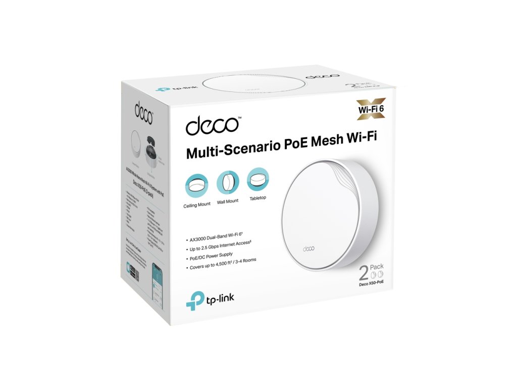 Deco X50-PoE - AX3000 Whole Home Mesh WiFi 6 System with PoE*AX3000 dvoupásmová WiFi – 2402 Mbps (5 GHz) + 574 Mbps (2,4 GHz).
