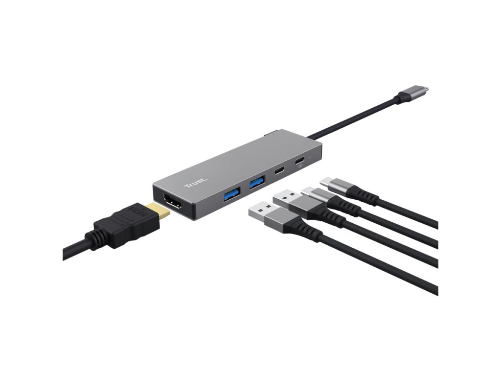Trust Dalyx 5-v-1 USB-C víceportový adaptérmultiportový adaptér 5 v 1 pro přidání portů HDMI, USB-C a USB-A k notebooku pomocí jediného připojení USB-C