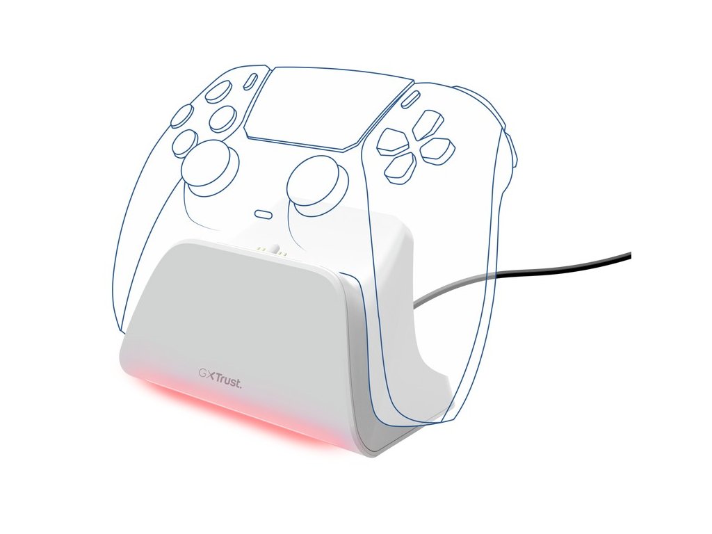 Trust GXT 255W Rychlonabíjecí stojan pro ovladače PS5Rychlonabíjecí stojánek pro ovladač PS5 s vícebarevnou LED diodou a indikátorem nabíjení