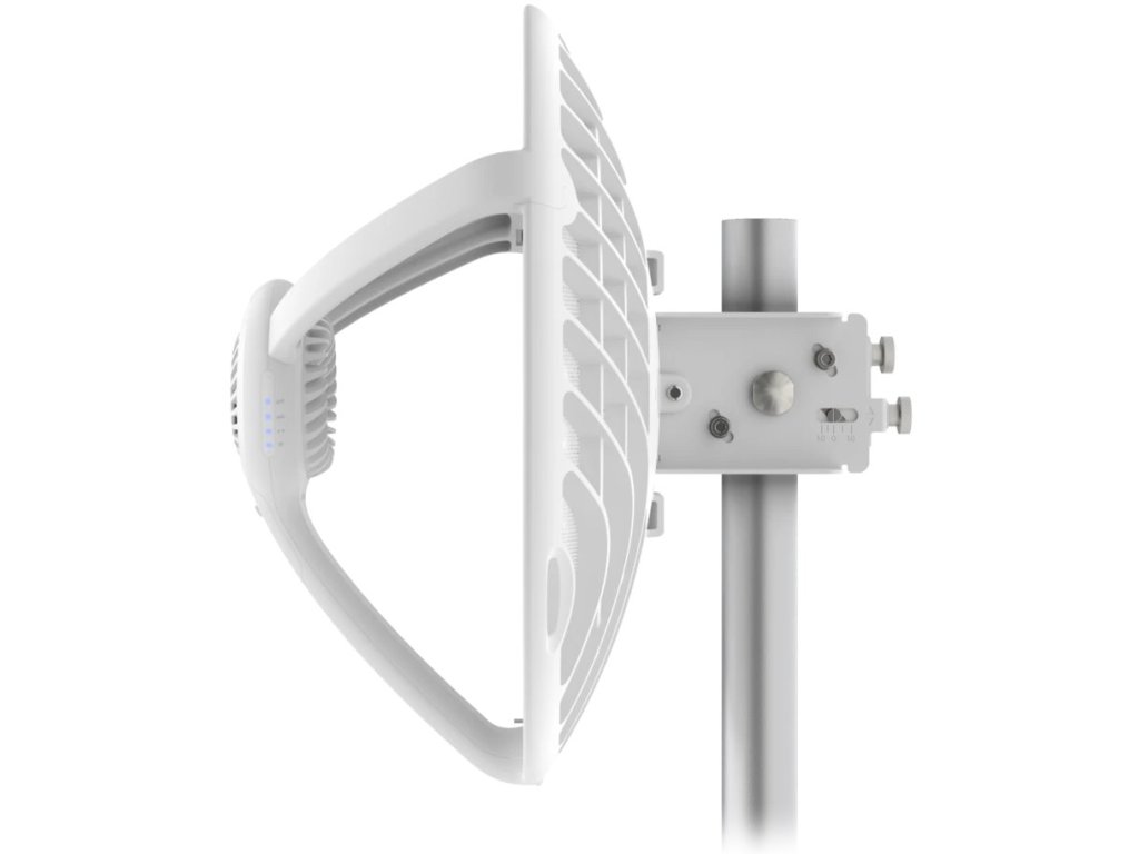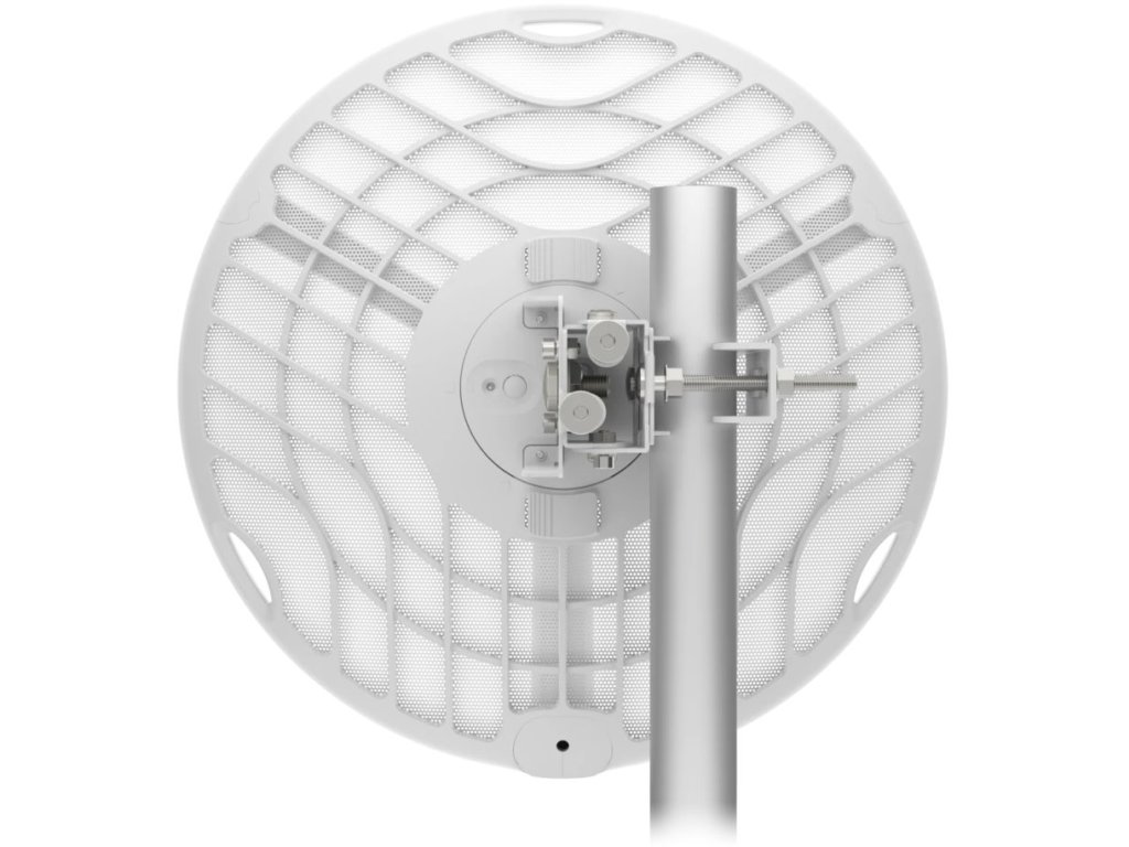 AirFiber 60 LR je velmi robustní jednotka včetně kovového precizního držáku, sítové parabolické antény se ziskem 38dBi a 3 plastových nožiček držících zářič, který obsahuje 60GHz rádiovou jednotku s Gigabitovým ethernetovým portem podporující pasivní 48V napájení a GPS modulem.