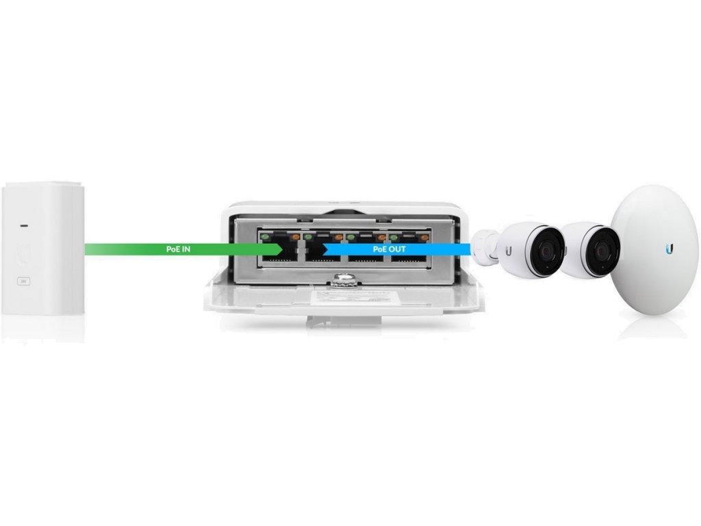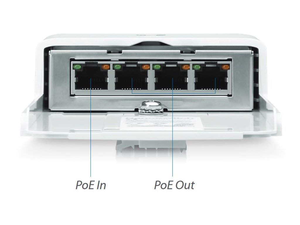 Zbylé 3 porty slouží pro napájení dalších zařízení s podporou 24V pasivního Gigabit PoE s podporou napájení po 2 párech (standard pro zařízení typu NanoStation, PowerBeam, AirGrid atd.).