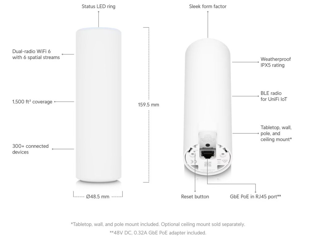 Vhodný pro vnitřní i venkovní použití díky IPX5 krytí. Bezproblémová integrace a správa pomocí síťového řešení UniFi. Součástí balení jsou držáky pro montáž na zeď, sloup a stůl.