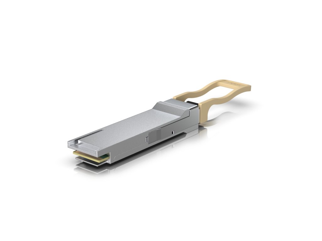 Transceiver QSFP28, který podporuje připojení 100G až do vzdálenosti 100 m pomocí multi-mode vlákna s konektorem MPO-12 typu B UPC.