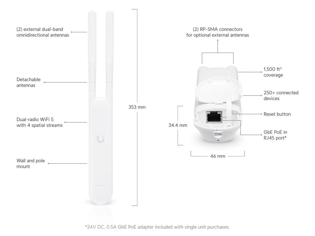 Jednotku můžete používat s přibalenými anténami se ziskem 3dBi (2,4GHz)/4dBi (5Ghz) nebo připojit k sektorovým anténám Ubiquiti.