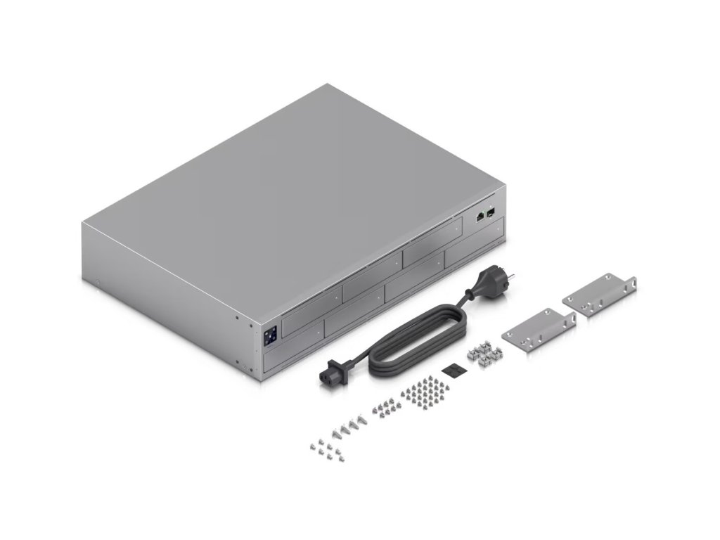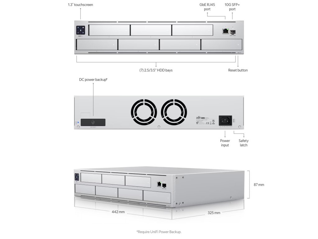 NVR má výkon pro nahrávání až 60 kamer ve Full HD rozlišení nebo 20 kamer ve 4K rozlišení a uchováním záznamu po dobu 60 dnů. NVR podporuje až 7 diskových pozic pro SSD/HDD s maximální kapacitou 16TB/disk, podporuje RAID 1/5/10 pro vyšší spolehlivost uchování dat, má 3" dotykový displej, který s pozdější verzí bude umožňovat i náhled videa, Gigabit LAN port, SFP+ port s podporou rychlostí 1G/10Gbps a redundantní napájení pomocí UniFi SmartPower (USP-RPS).
