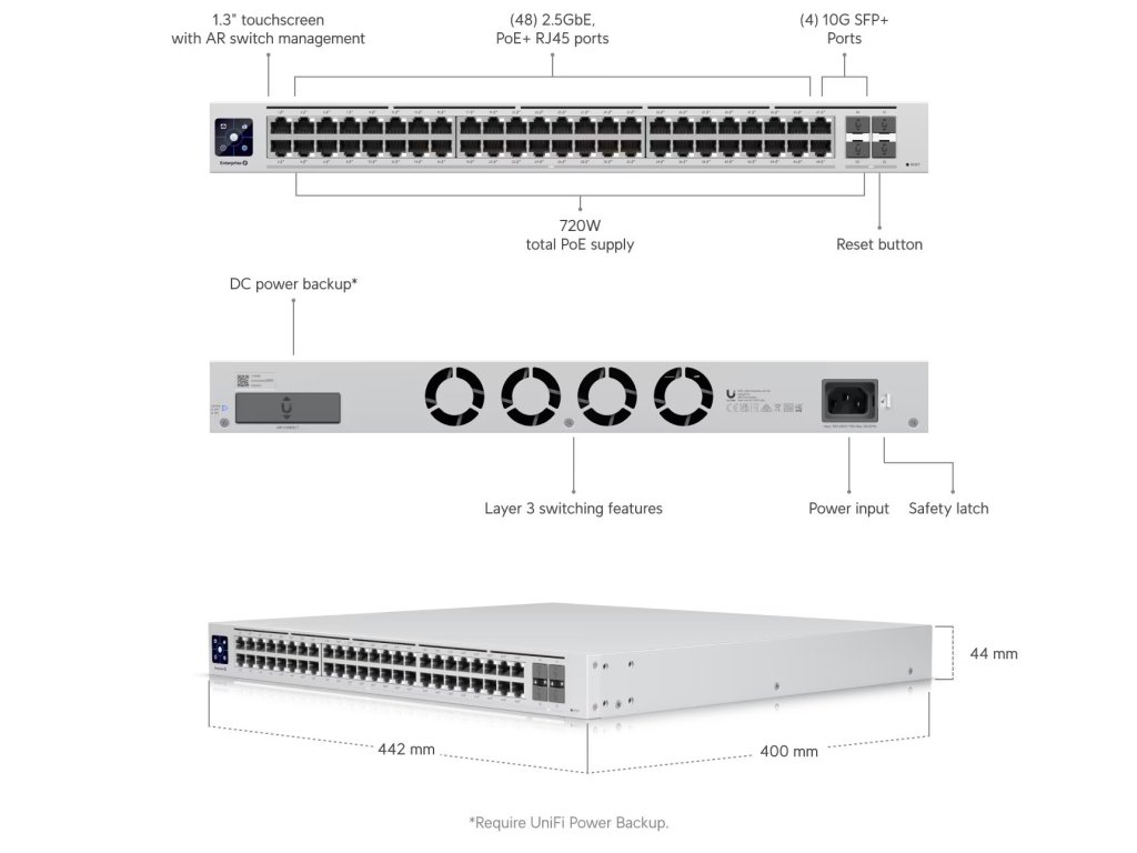 Všechny ethernetové porty podporují 802.3af/at PoE-Out s výstupním výkonem 30W/port a celkovým PoE Budgetem 720W. Switch má kromě standardní výbavy také 1,3" dotykový displej pro poskytování informací o systému, teplotě, statistice portů, PoE napájení a mnoho dalšího. Switch lze napájet standardně přes 230V ale také přes UniFi SmartPower RPS, který slouží spíše k zálohování napájení v případě selhání interního zdroje.