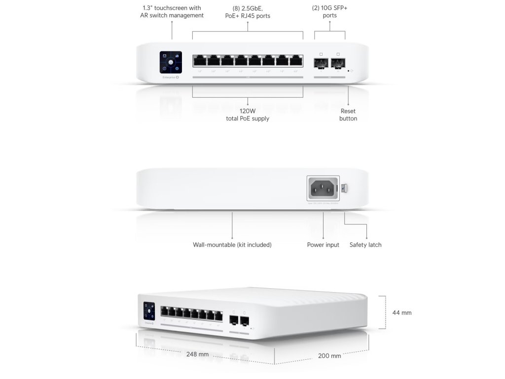 UniFi Switch Enterprise 8 PoE je spolehlivý managovatelný 2,5-Gigabitový L3 Switch (L3 podporováno v budoucích fw) s kapacitou přepínání 80Gb/s, (8) 2,5-Gigabit LAN porty a dvěma SFP+ (10Gb/s) šachtami. Všechny ethernetové porty podporují 802.3af/at PoE-Out s výstupním výkonem 30W/port a celkovým PoE Budgetem 120W.