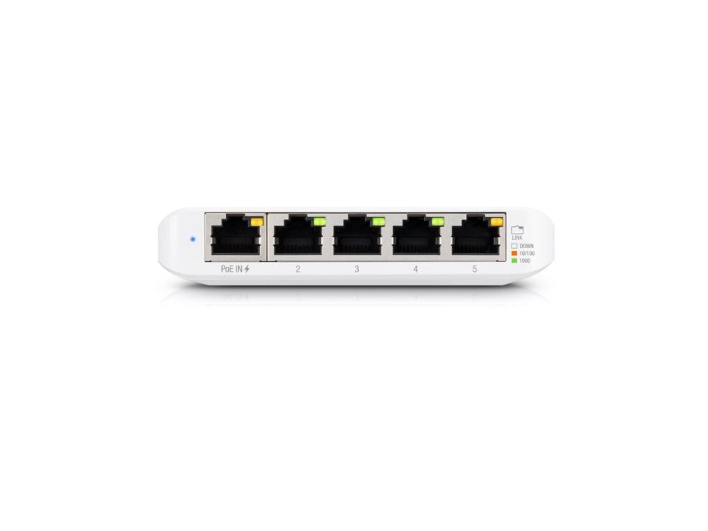 USW-Flex-Mini je maličký 5-portový Gigabitový switch se správou přes UniFi Network application od Ubiquiti v desktop provedení s prvním portem podporujícím PoE In.