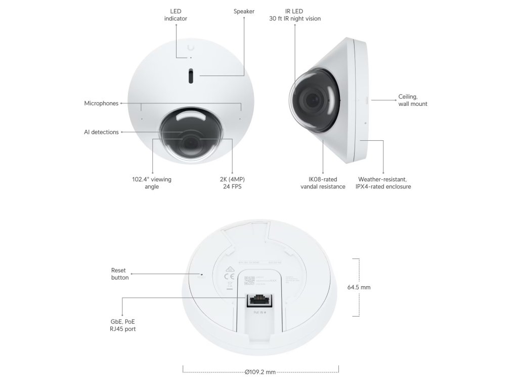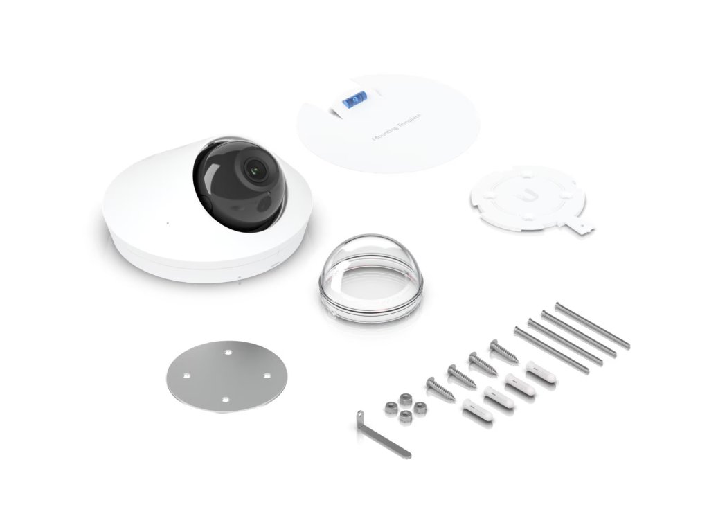 UniFi Protect G4 Dome kamera disponuje 4MP snímačem (2688x1512px) při 24fps, fixním objektivem (cca 4mm), IR přísvitem pro noční vidění, mikrofonem a reproduktorem.