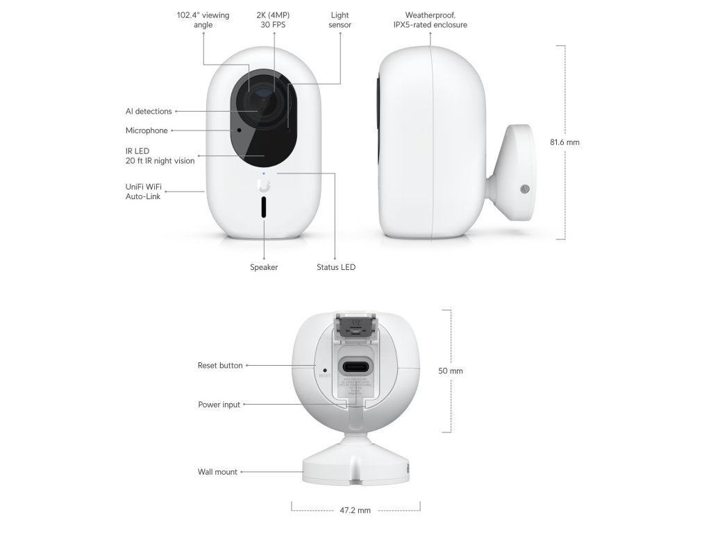 Popis produktuUniFi Protect G4 Instant kamera disponuje 5MP snímačem (2688x1512px) při 30fps, fixním objektivem 2,8mm, IR přísvitem pro noční vidění, mikrofonem a reproduktorem. Kamera má robustní a kompaktní tělo z polykarbonátu, odolnost IK04 proti vandalům a krytí IPX5 proti tryskající vodě. Do sítě se kamera připojuje pomocí Dual-Band WiFi s podporou standardů 802.11a/b/g/n/ac a napájení je řešeno přes USB-C kabel (5V/2A) s maximální spotřebou 6W.