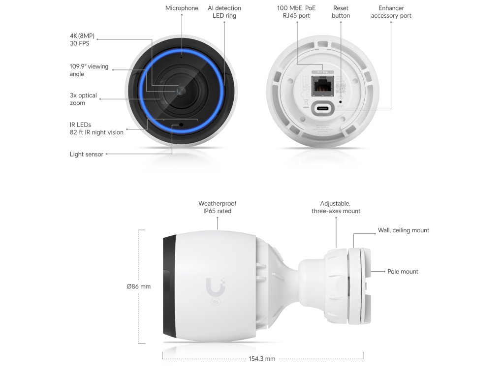 Ubiquiti G5 ProfessionalVnitřní/venkovní kamera 4K PoE s výjimečným obrazovým výkonem a objektivem s 3x optickým zoomem.