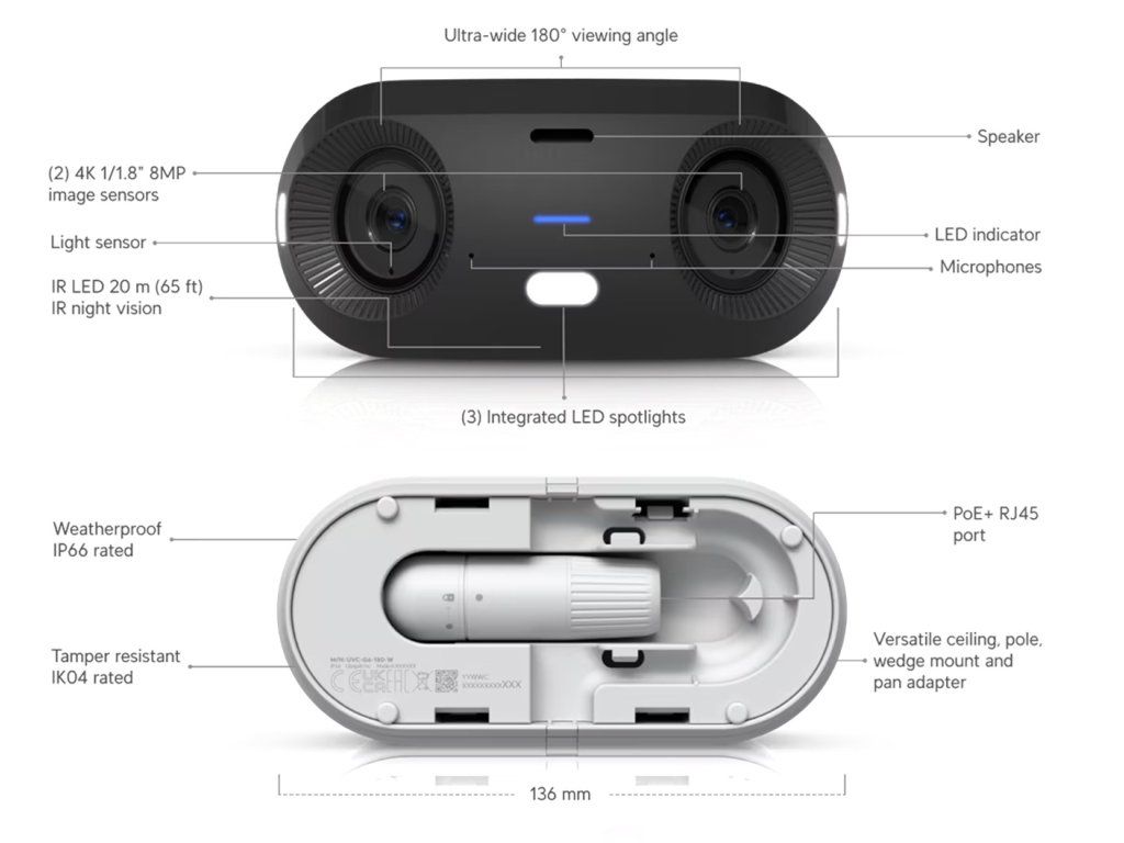 Bezpečnostní kamera Ubiquiti UVC-G6-180-W je ideálním řešením pro monitorování v exteriéru díky své robustní konstrukci a pokročilé technologii. Tento model patří do řady Ultra HD a nabízí skvělý výkon s rozlišením 16MP 7680 x 2160 a dvojitým 4K senzorem, který poskytuje ostřejší a detailnější obraz. Další výhodou této kamery je výjimečný zorný úhel 180°, což zajišťuje široký záběr a efektivní pokrytí prostoru. Kamera je také vybavena dvoucestným audio systémem a schopností rozpoznávat obličeje a registrační značky vozidel, což přispívá k vyšší úrovni bezpečnosti.