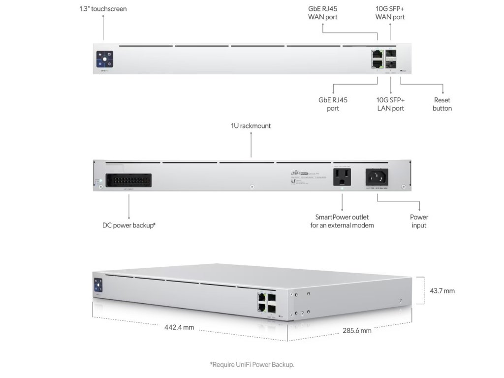 UXG Pro je vybavena dvěma WAN porty - Gigabitový ethernet a 10G SFP+ slot, které poskytují možnost failoveru v případě selhání konektivity a také další 2 porty LAN - Gigabitový ethernet a 10GSFP+ slot, které poskytují dostatečnou kapacitu pro většinu aplikací.