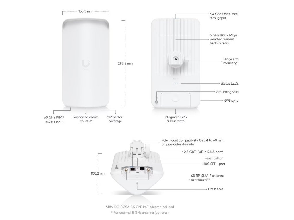 Wave Access Point může připojit až 31 stanic a poskytovat celkovou propustnost až 5,4Gb/s (duplex 2,7Gb/s). Je vybaven vysoce výkonným záložním rádiem 5GHz pro zajištění nepřerušovaného připojení a také Bluetooth pro zjednodušení nastavení v aplikaci UISP Mobile. Zařízení podporuje pokročilé funkce jako Wave AI a integruje se s UISP pro snadnou správu.