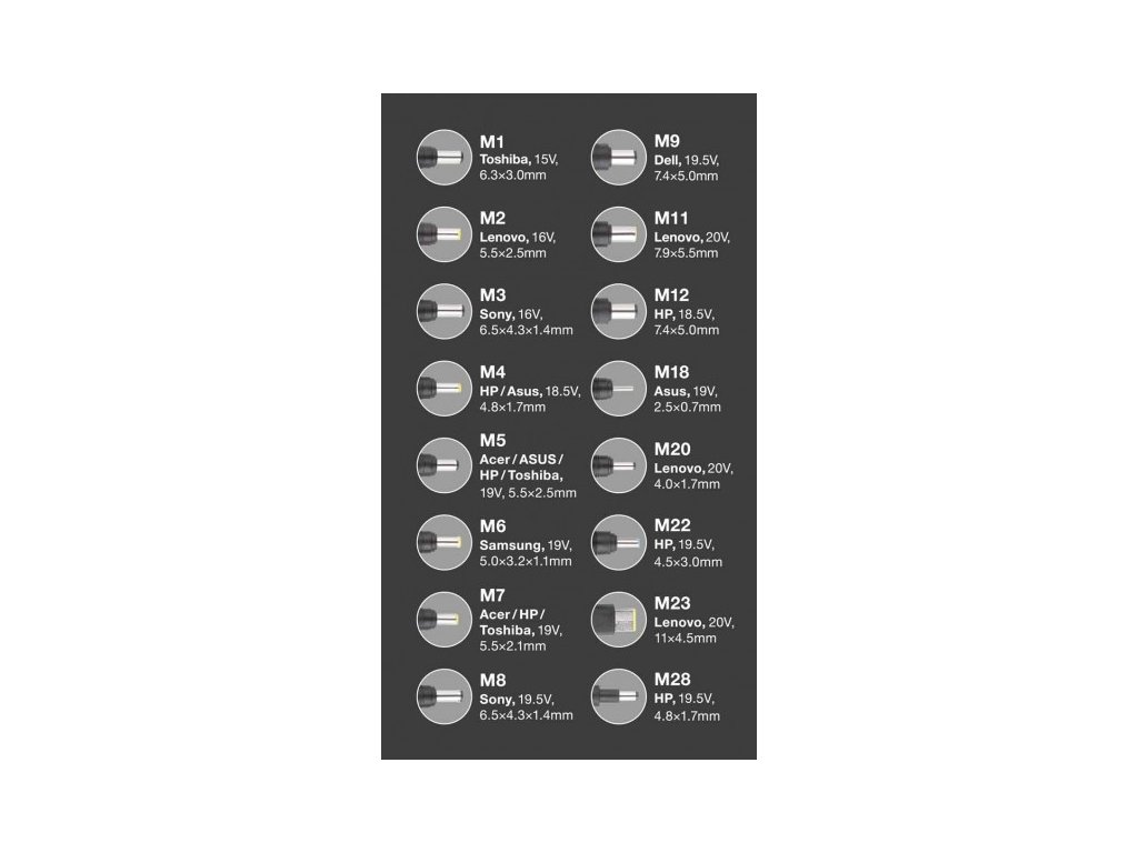 Vyberte si jeden ze 16 přiložených konektorů, který bude vhodný pro nabíjení Vašeho zařízení. Díky úžasné délce přívodu 2,7m je adaptér tak pohodlným doplňkem doma i na cestách, kde zásuvky nemáte vždy po ruce.