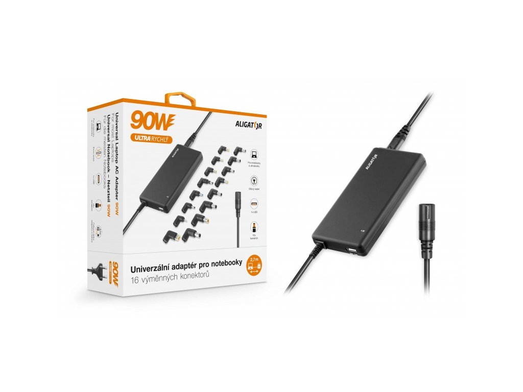 Univerzální adaptér pro notebooky se 16 výměnnými konektory a USB, 90WUltra tenký síťový adaptér se 16 výměnnými konektory, USB a fantastickým výkonem 90W řady ALIGATOR POWER.