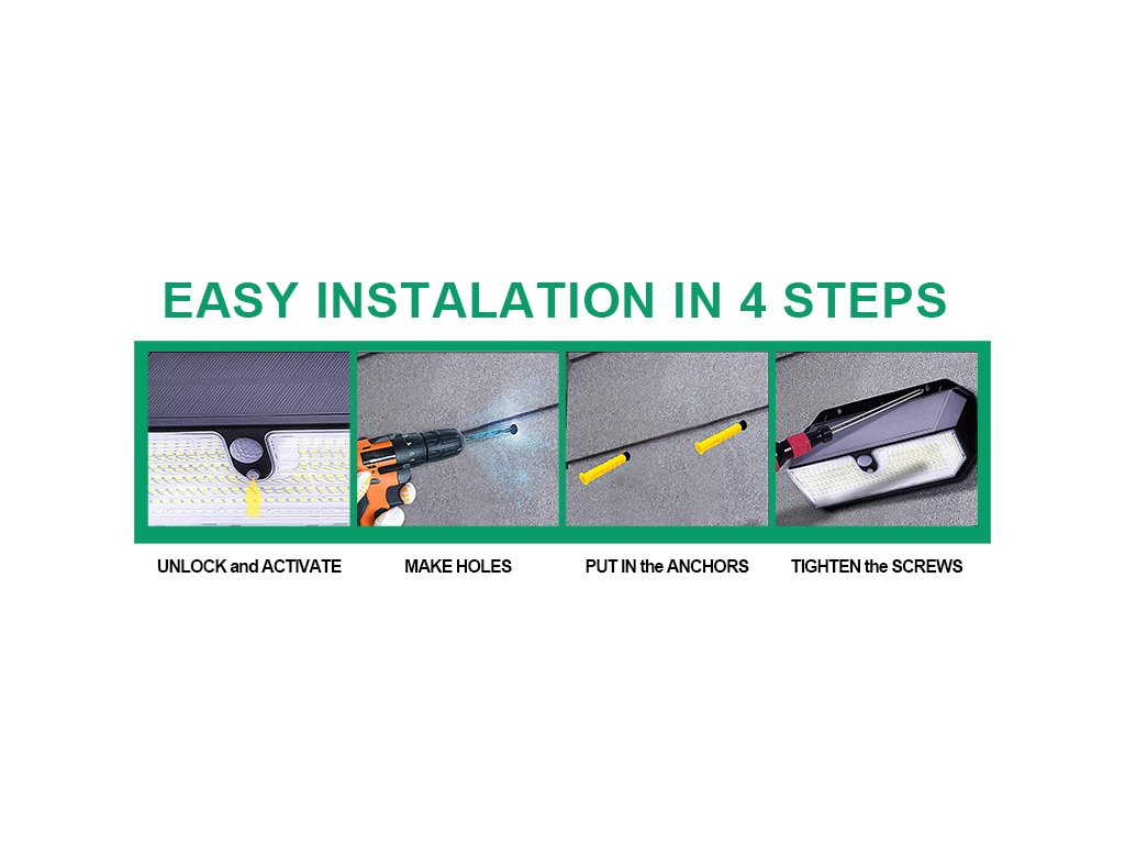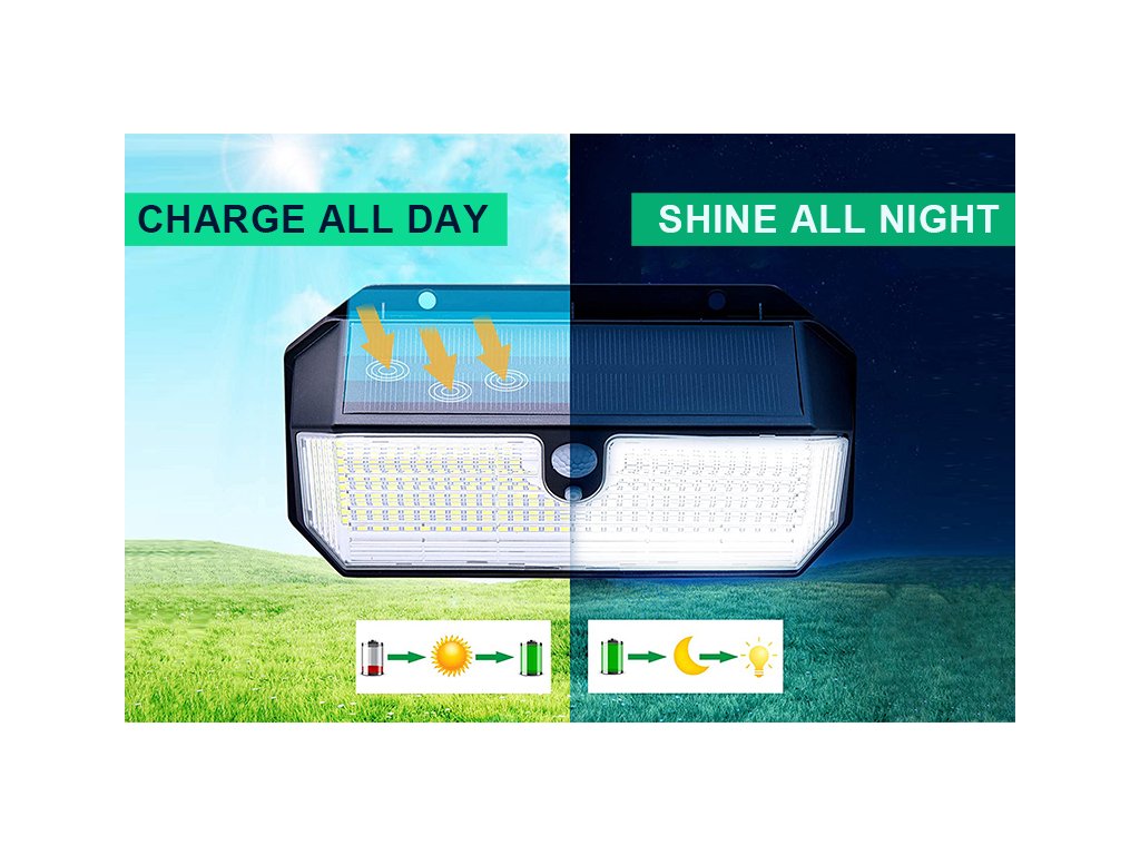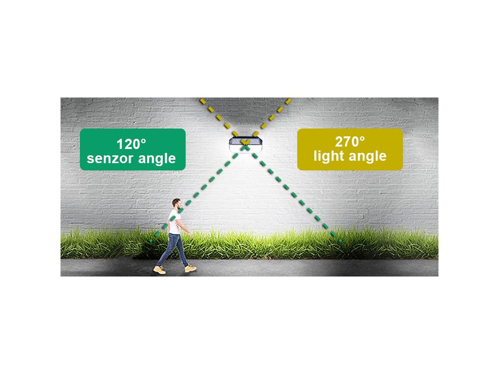 Baterie v solárním světle poskytuje dostatečný výkon pro celonoční osvětlení. Doba svitu záleží na intenzitě světla. Podle vybraného světelného režimu vám LED světlo vydrží svítit 8-12 hodin. Vestavěný pohybový senzor detekuje pohyb v rozmezí od 3 do 5 m v pozorovacím úhlu 120° a zároveň dokáže rozpoznat falešný pohyb (pohyb větví, vítr, atd.)