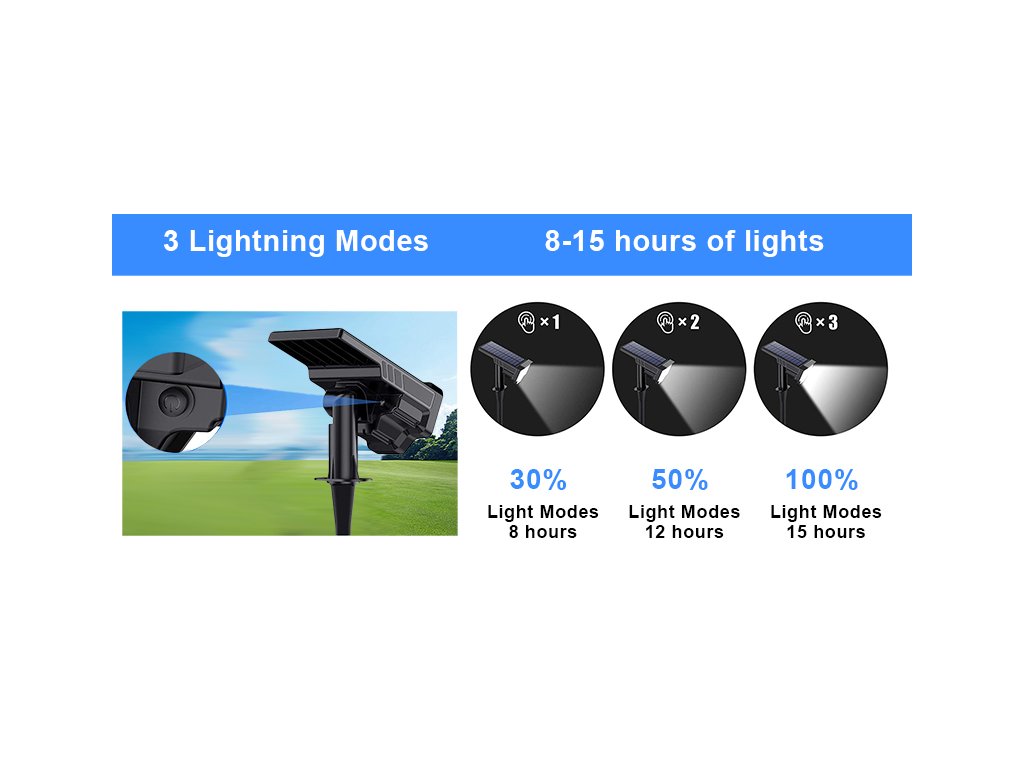 Baterie v solárním světle poskytuje dostatečný výkon pro celonoční osvětlení. Doba svitu záleží na intenzitě světla. Podle vybraného světelného režimu vám LED světlo vydrží svítit 8-15 hodin.