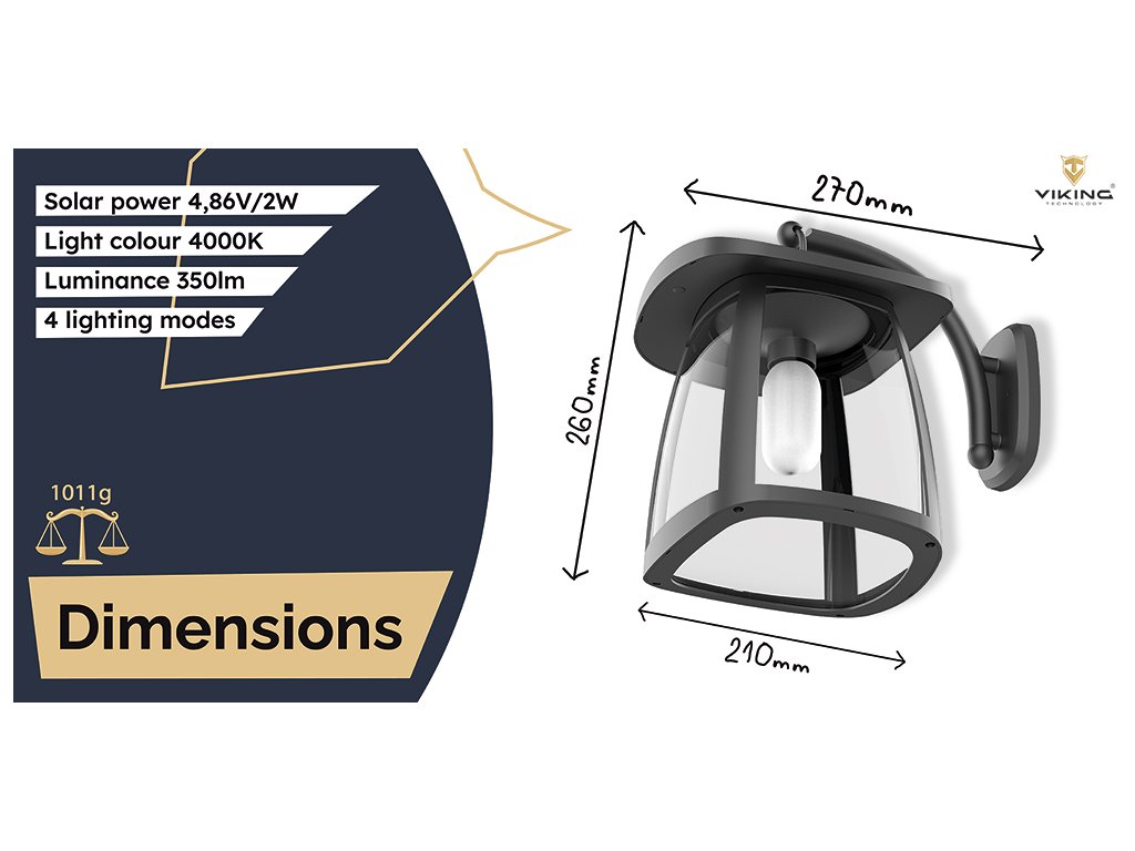 Použitý monokrystalický solární panel disponuje výkonem 4,86 V/2 W. Pokud venku panují nevhodné podmínky, světlo Viking SR10W dokáže fungovat až 10 dní.