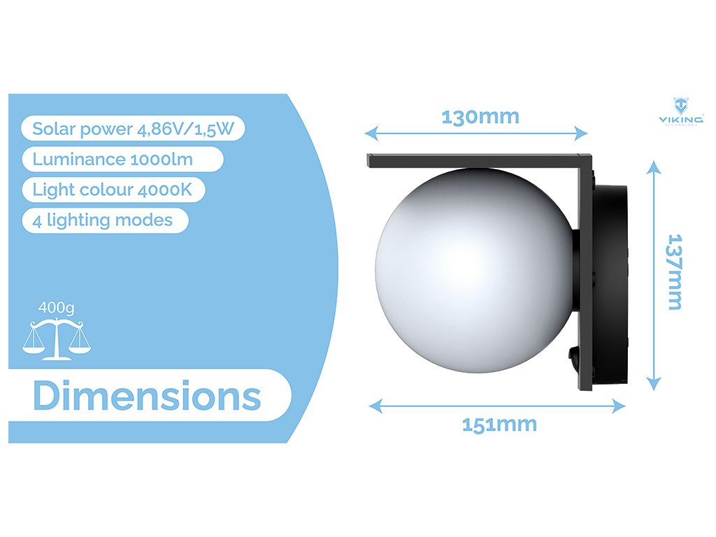 PIR senzor s úhlem detekce 120° má dosah až 5 metrů. Jakmile bude detekován pohyb, světlo se automaticky rozsvítí. Moderní a výkonný monokrystalický solární panel poskytuje vysoký nabíjecí výkon. Viking SR26 disponuje robustním provedením s certifikovaným stupněm odolnosti IP54.