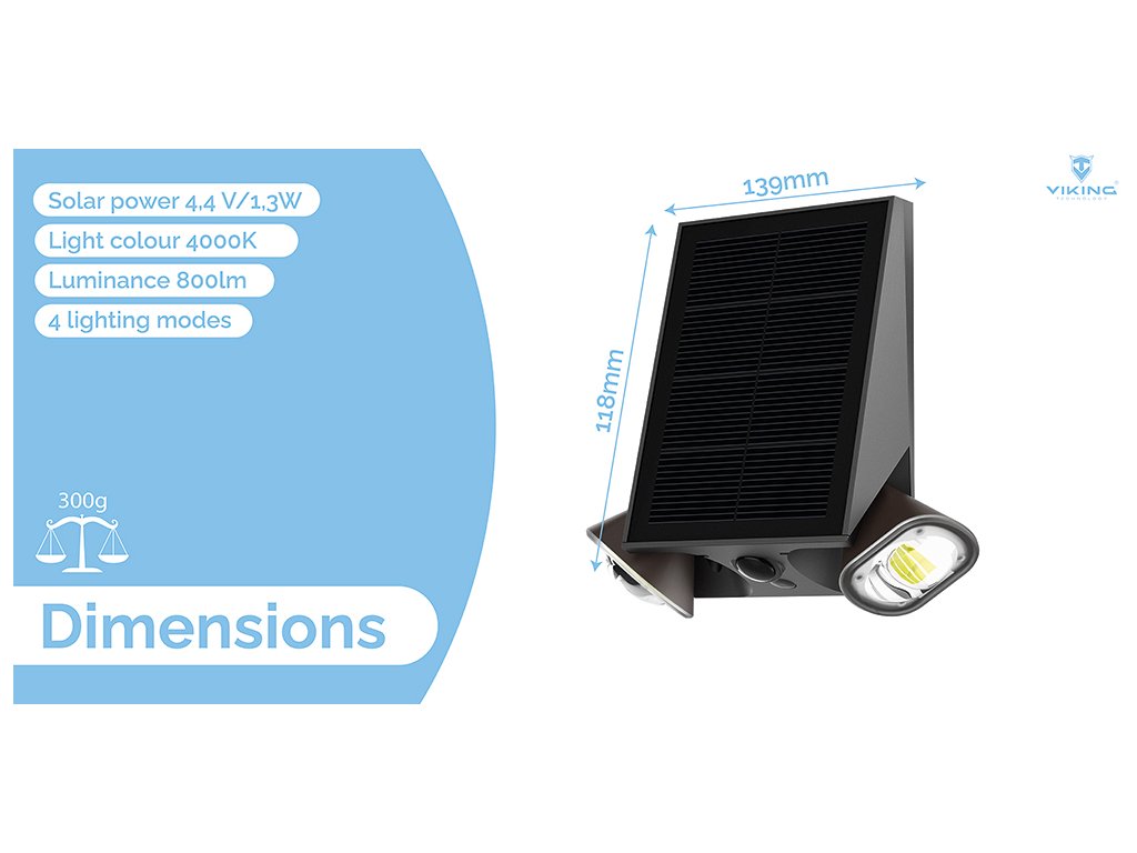 Svítivost 800 lm • solární napájení • barva světla 4000K (denní bílá) • 4 režimy osvětlení • doba osvětlení za nevhodných podmínek více než 7 dní • odolnost IP44 • kapacita baterie 3,7V/7,4 Wh • výkon solárního panelu 4,4 V/1,3 WVenkovní solární LED světlo s pohybovým senzorem Viking SR39