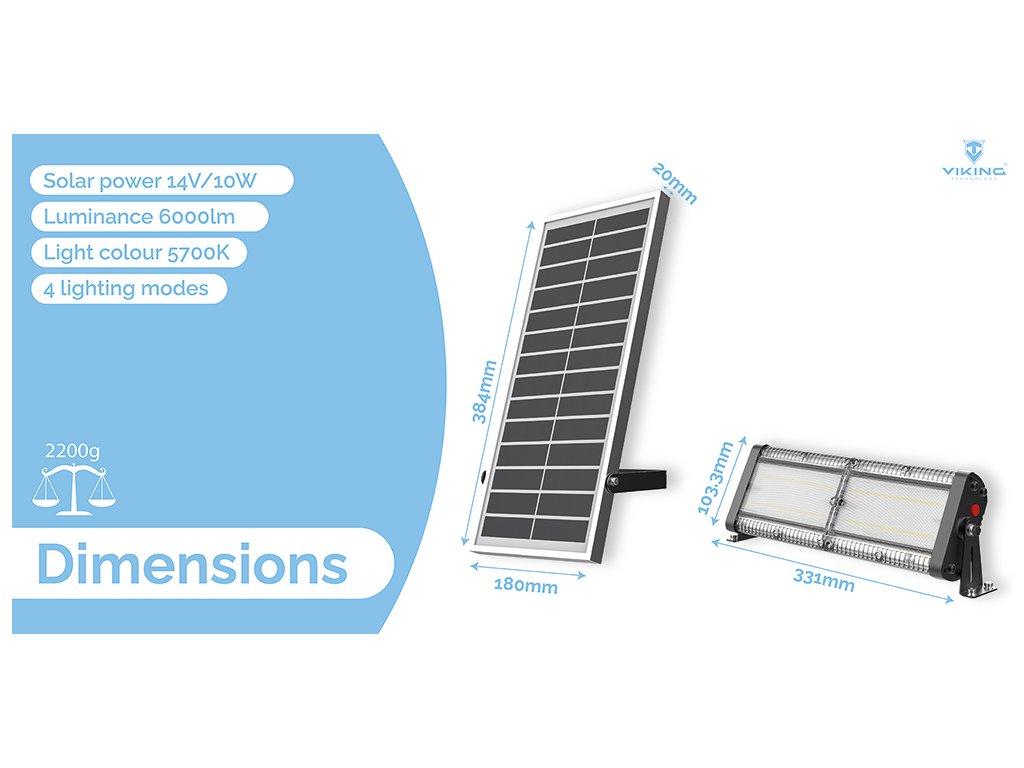 Svítivost 6000 lm • solární napájení • barva světla 5700K (studená bílá) • 4 režimy osvětlení • doba osvětlení za nevhodných podmínek více než 3 dny • odolnost IP65 • kapacita baterie 3,7V/57,72 Wh • výkon solárního panelu 14V/10WVenkovní solární LED světlo Viking SR40
