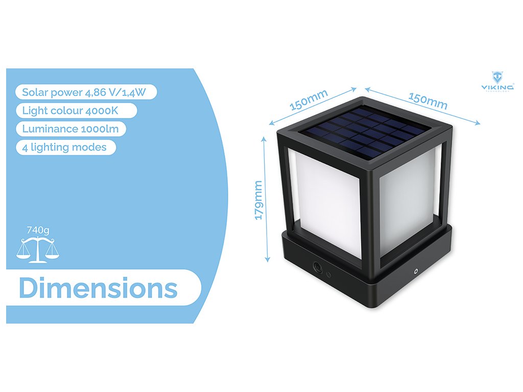 Svítivost 1000 lm • solární napájení • barva světla 4000K (denní bílá) • 4 režimy osvětlení • doba osvětlení za nevhodných podmínek více než 10 dní • odolnost IP54 • kapacita baterie 3,7V/7,4 Wh • výkon solárního panelu 4,86 V/1,4 WVenkovní solární LED světlo s pohybovým senzorem Viking SR54