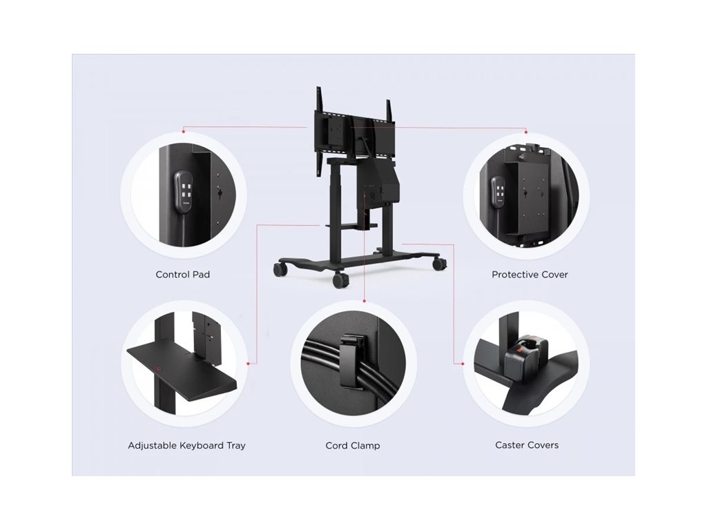 Viewsonic - VB-STND-007Motorizovaný stojan ViewSonic na kolečkách bezpečně pojme interaktivní ploché panely ViewSonic 55“, 65“, 75“ a 86" ViewBoard nebo jakýkoli displej s hmotností až 75 kg. Díky integrovanému ovládání na obrazovce lze výšku stojanu snadno nastavit pomocí panelu nástrojů aplikace ViewBoard bez přerušení výuky.