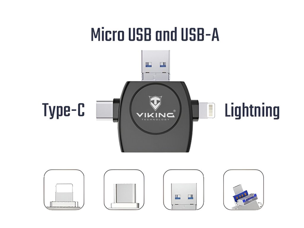 Viking čtečka paměťových karet V4 USB3.0 4v1 • 4 konektory: Lightning, Micro USB, USB-A 3.0, USB-C • Vhodný pro iOS, Android, Windows i Linux • Podpora většiny běžných formátů souborů • Rozšíření paměti telefonu, tabletu nebo notebooku • Malé, lehké zařízení s ochranným pouzdrem • hmotnost 10gViking čtečka paměťových karet V4 USB3.0 4v1
