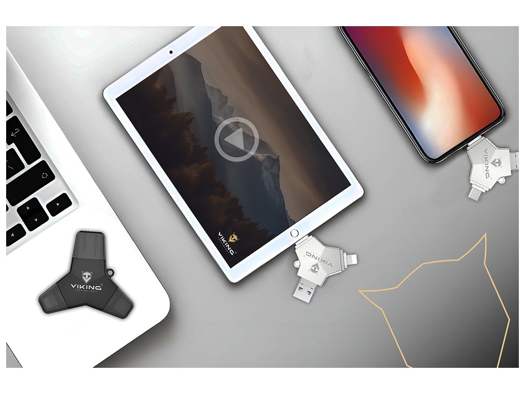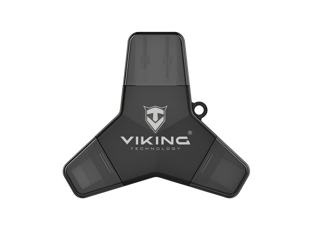 Viking USB flash disk 3.0 • 4 konektory: USB-A, USB-C, Micro USB, Lightning • Tři varianty: 32 GB, 64 GB nebo 128 GB • rychlost až 100?MB/s • podpora FAT32 a exFAT • vhodný pro iOS, Android, PC i Mac • Kompaktní a lehké provedení • hmotnost 17,2?gViking USB flash disk 3.0 4v1 128GB