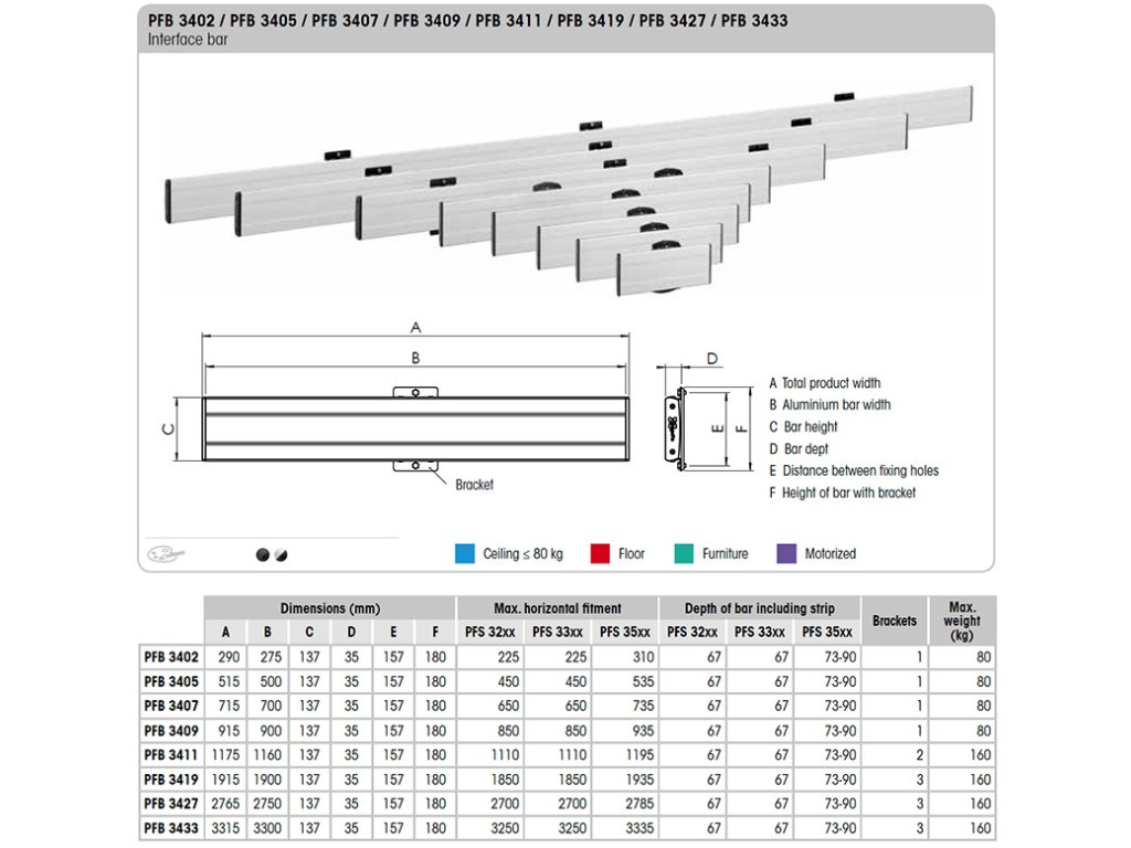 Horizontální část adaptéru systému Connect-it slouží k přímé montáži displeje na zeď, nebo na stropní držáky, stojany a další prvky systému Connect-it. Dodává se v několika délkách, při výběru se řídíme horizontální roztečí montážních otvorů konkrétního displeje (VESA) a jeho šířkou tak, aby adaptér nepřečníval. Ideální pro montáž více displejů vedle sebe a videostěn. Jednotlivé díly lze spolu spojovat do libovolně dlouhých pásů. K vytvoření kompletního adaptéru je třeba vodorovný pás doplnit o vertikální ramena PFS 3xxx.Hlavní charakteristiky:
