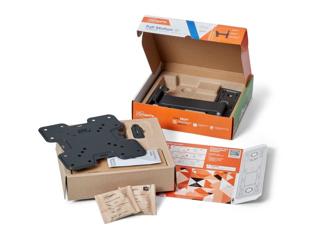 Součástí nástěnného držáku televizoru QUICK Full-Motion je montážní materiál. Součástí balení je standardně vrtací šablona, šrouby a hmoždinky Fischer® DuoPower. Stejně jako vodováha a stahovací páska pro pevné a bezpečné svázání kabelů. Rychlá instalační příručka vysvětluje krok za krokem, jak vše bezpečně nainstalovat. Můžete si také prohlédnout podrobný návod nebo instalační video. Najdete je na internetu. K vyznačení prvního vrtaného otvoru můžete použít naši bezplatnou aplikaci DrillRight™ AR.