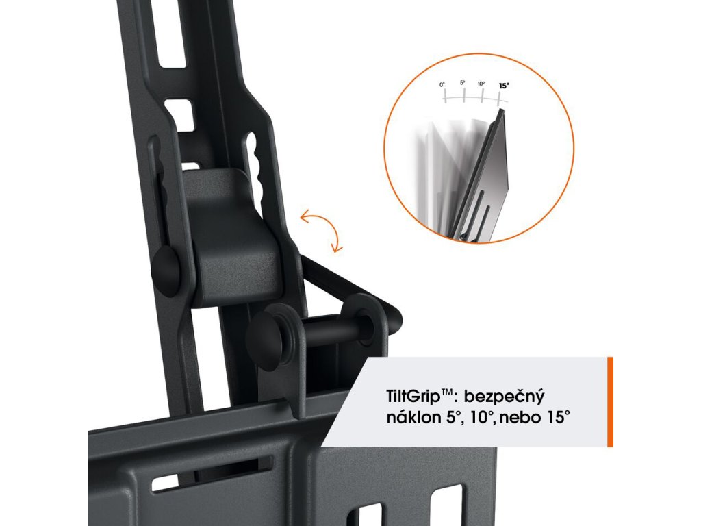S tímto nástěnným držákem televizoru QUICK Tilt si usnadníte práci a zajistíte pohodlí. Instalace je velmi snadná, TV připevníte na stěnu za max. 20 minut. Nakloněním držáku o 5°, 10° nebo 15° si můžete nastavit požadovaný pozorovací úhel, což je funkce, která je obzvláště příjemná, pokud je váš televizor namontován o něco výše na zdi. Držák je vhodný pro televizory s úhlopříčkou 32 až 65 palců a hmotností do 25 kg.