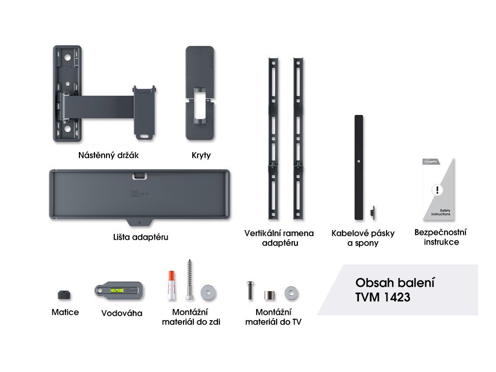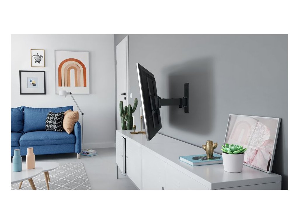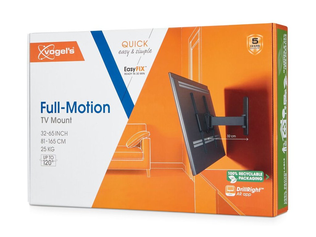 Rádi byste si svůj televizor užívali naplno, i když nesedíte přímo před ním? Tento nástěnný držák televizoru QUICK Full-Motion vám to umožní. Držák můžete otočit o 120° a naklonit o 15°. A nebojte se, pokud nejste tak šikovní. Instalace držáku je velmi snadná. TV můžete bezpečně připevnit na stěnu za 30 minut. TVM 1423 je vhodný pro televizory s úhlopříčkou 32 až 65 palců a hmotností do 25 kg.